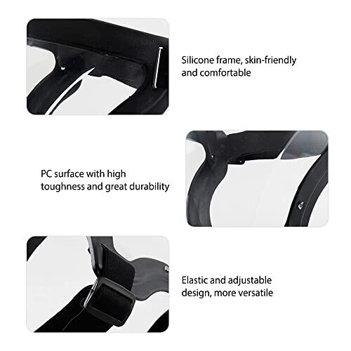 Silicone frame is skin-friendly and comfortable with a curved design that fits the chin; elastic band is adjustable for a secure fit. Made of high-quality polycarbonate (PC) material with high toughness and durability. Provides protection from water, dust and other harmful substances. Breathable design with a built-in 5-layer anti PM2.5 activated carbon filter. Weight is approximately 193 g. Transparent shield allows clear vision; surface is waterproof, windproof and anti-fog. Suitable for house cleaning, cooking, home decoration, cycling and other outdoor activities.