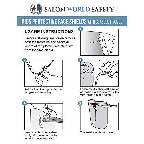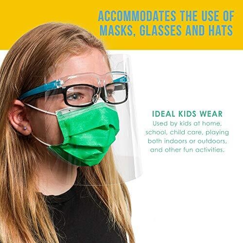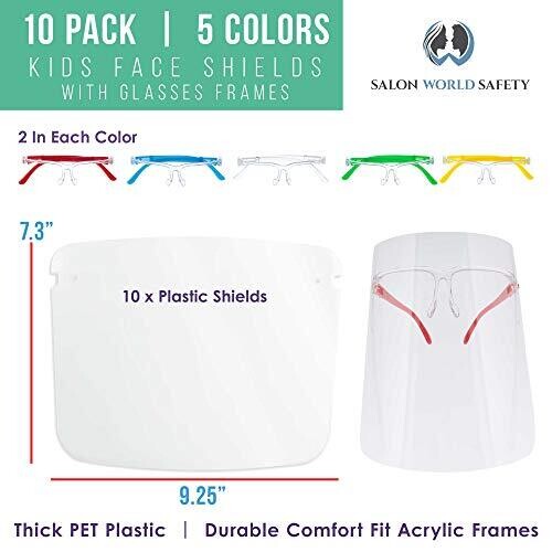 - Marketing-focused, vibrant packaging appeal highlighting a 10-pack set of kids face shields with built-in glasses frames in 5 colors to match every kid’s style.