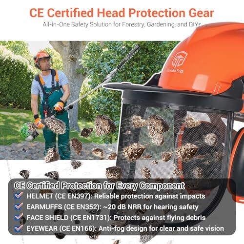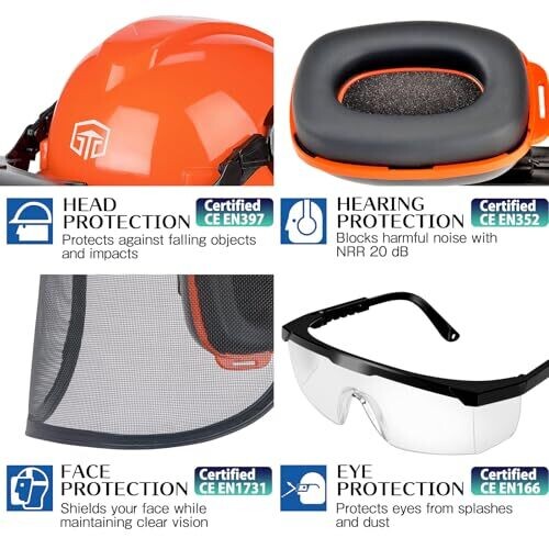 All-in-one protective gear combines a helmet, face shield, and ear protection in a lightweight unit. Adjustable headband, removable ear protectors, anti-fog goggles, and a mesh visor offer clear visibility and comfortable fit for forestry and chainsaw tasks.